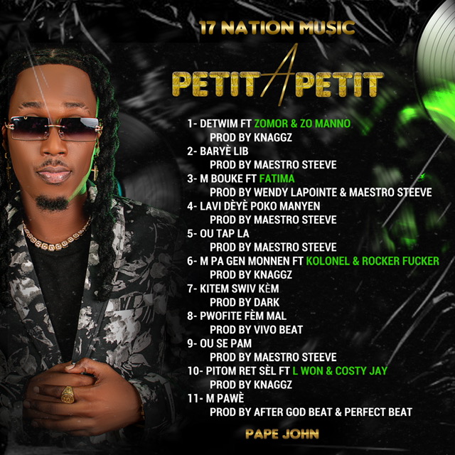 François Jean François, plus connu sous le nom de Pape John, originaire du Nord-Ouest d’Haïti, franchit une étape importante dans sa carrière musicale. En effet, le 7 octobre 2025, il dévoile Petit-à-Petit, son premier album, un projet élaboré sur plusieurs mois où se croisent introspection, partage et sensibilité. Par ailleurs, sur ces onze titres, il réunit plusieurs artistes de la scène haïtienne contemporaine : Fatima, Zo Manno, Zomor, L-Won, Costy Jay, Kolonel Freez et Roker Fucker. Ainsi, chacun contribue à une œuvre nourrie d’expériences vécues et de regards sur la vie.