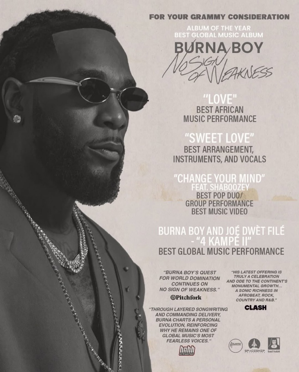 Dans le cadre de cette édition, Burna Boy a également soumis son huitième album studio, “No Sign of Weakness“, ainsi que plusieurs chansons issues de ce projet pour évaluation par l’Académie. L’album, publié le 11 juillet 2025, comprend des collaborations avec des artistes tels que Travis Scott et Mick Jagger. Par conséquent, il figure dans les catégories “Album of the Year” et “Best Global Album“. De plus, la chanson “Love” a été inscrite dans les catégories “Best African Music Performance” et “Best Global Music Performance“, tandis que 4 Kampé II concourt spécifiquement pour Best Global Music Performance et “Song of the Year“.