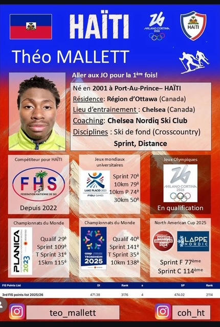 Enfin, Théo Mallet, né en 2001 à Port-au-Prince et établi dans la région d’Ottawa, évolue en ski de fond au sein du Chelsea Nordiq Ski Club. Engagé régulièrement sur le circuit nord-américain, il multiplie les compétitions internationales depuis 2022. Il a notamment pris part aux Jeux mondiaux universitaires, avec des classements du 50ᵉ rang sur 30 km au 78ᵉ sur 10 km. Aux Mondiaux de Planica en 2023, il participe au sprint (109ᵉ), au team sprint (31ᵉ) et au 15 km (115ᵉ). Ses résultats récents en North American Cup 2025 — qualification en 40ᵉ position, 141ᵉ du sprint, 35ᵉ du team sprint, 138ᵉ du 10 km — ainsi qu’à Lappe Nordic (77ᵉ et 114ᵉ en sprint) illustrent une progression régulière. Toujours en phase de qualification, il poursuit sa préparation en vue d’une première participation olympique.