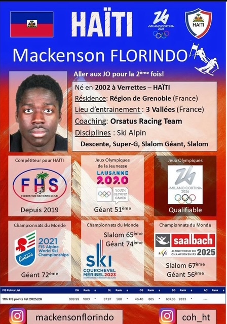 Mackenson Florindo, né en 2002 à Verrettes et installé dans la région de Grenoble, vise une seconde participation olympique. Il s’entraîne au sein de l’Orsatus Racing Team dans les 3 Vallées et concourt en descente, Super-G, slalom géant et slalom. Son parcours comprend une participation aux Jeux olympiques de la Jeunesse en 2020 (51ᵉ en géant), ainsi que plusieurs championnats du monde : 72ᵉ en géant et 65ᵉ en slalom en 2021, 74ᵉ en géant en 2023, puis 67ᵉ en slalom et 56ᵉ en géant aux Mondiaux 2025 de Saalbach. Actif sur le circuit international depuis 2019, il demeure officiellement en quête de qualification pour Milano Cortina.