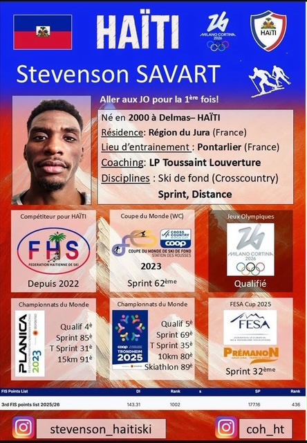 Pour Stevenson Savart, né en 2000 à Delmas et résidant dans le Jura français, Milano Cortina 2026 marquera une première participation olympique. Fondeur spécialisé dans le sprint et la distance, il s’entraîne à Pontarlier au sein du LP Toussaint Louverture. Sur les circuits internationaux, ses résultats témoignent de ses progrès : 62ᵉ du sprint en Coupe du monde 2023, participations aux Mondiaux de Planica la même année (85ᵉ en sprint, 91ᵉ sur le 15 km), plusieurs épreuves en FESA Cup 2025 où il obtient notamment des qualifications en 4ᵉ et 5ᵉ position, ainsi qu’un 32ᵉ rang en sprint à Prémanon. Engagé dans l’équipe haïtienne depuis 2022, il étend la présence du pays dans une discipline exigeante sur le plan technique et physique.