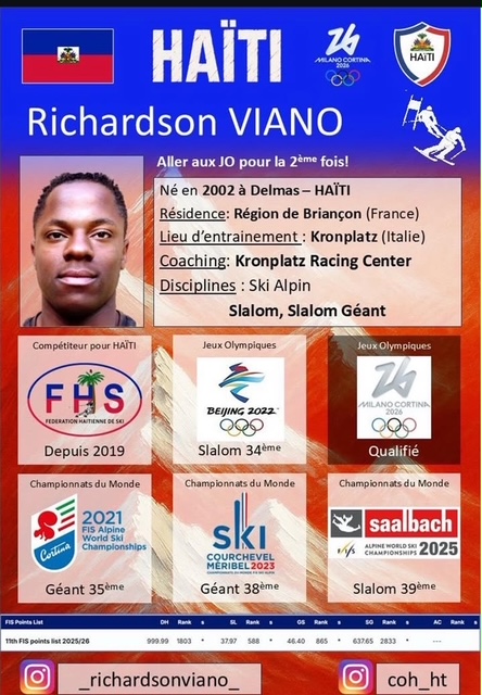 Né en 2002 à Delmas et installé dans la région de Briançon, Richardson Viano se prépare à participer à ses deuxièmes Jeux olympiques d’hiver. Spécialiste du ski alpin, engagé en slalom géant, il s’entraîne au Kronplatz Racing Center en Italie. Depuis son arrivée sur la scène internationale sous les couleurs d’Haïti en 2019, son parcours comprend plusieurs résultats : 34ᵉ du slalom aux Jeux de Pékin en 2022, 35ᵉ du géant aux Mondiaux FIS 2021, 38ᵉ du géant à Courchevel/Méribel en 2023 et 39ᵉ du slalom aux Mondiaux 2025 de Saalbach.