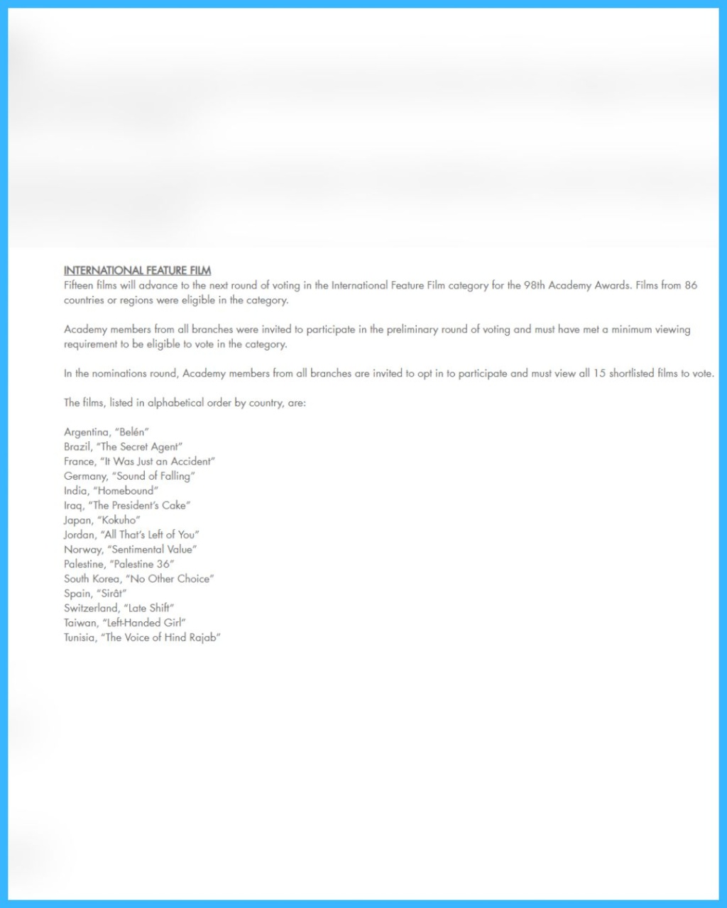 Pour cette édition, 86 pays ou régions avaient proposé un film pour concourir dans cette catégorie, conformément aux règles de l’Académie, qui exigent que chaque production soit tournée hors des États-Unis et contienne majoritairement des dialogues non anglophones. Les membres de l’Académie, toutes branches confondues, ont participé à un premier tour de vote, sous réserve d’avoir respecté un nombre minimum de visionnages.